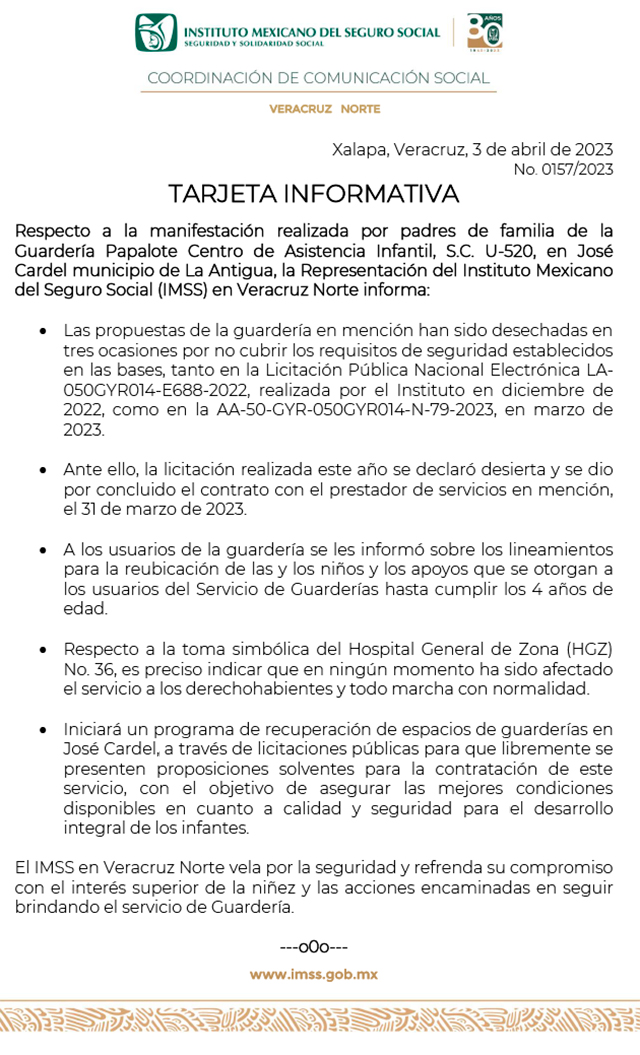 A la guardería Papalote, de Cardel, se le dio por concluido el contrato, informa IMSS