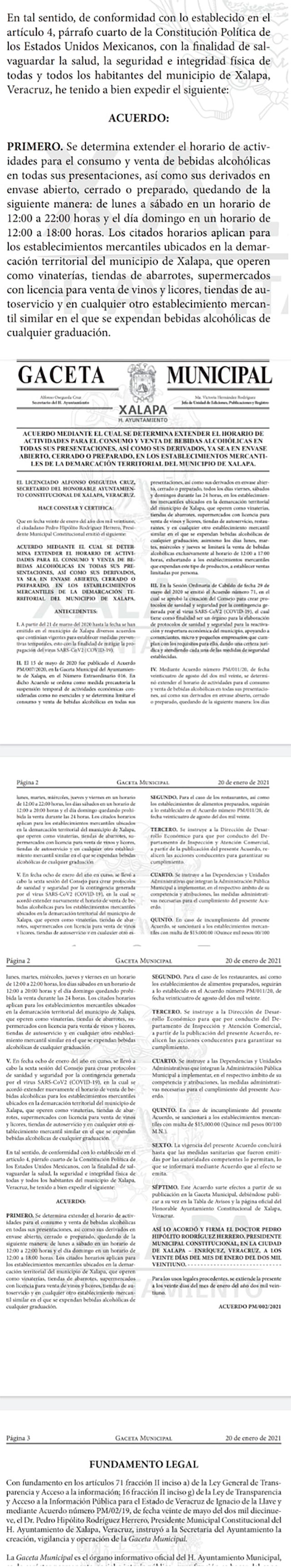 Se especificó que dichos horarios aplican para los establecimientos mercantiles ubicados en la demarcación territorial del municipio de Xalapa, que operen como vinaterías, tiendas de abarrotes, supermercados con licencia para venta de vinos y licores, tiendas de autoservicio y en cualquier otro establecimiento mercantil similar en el que se expendan bebidas alcohólicas de cualquier graduación.