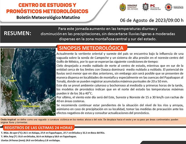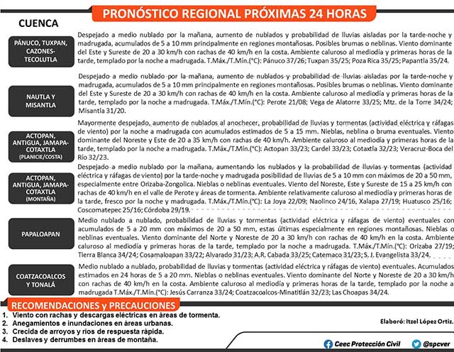 En las próximas 24 horas se prevé disminuya el potencial para lluvias y tormentas (actividad eléctrica y ráfagas de viento) en el estado de Veracruz, con los acumulados más altos sobre regiones montañosas y cuencas del sur, situación ocasionada en gran medida por una vaguada establecida en el suroeste del Golfo de México. El ambiente al mediodía y primeras horas de la tarde continuará relativamente caluroso en zonas altas y caluroso y bochornoso en el resto de la entidad. Se espera viento dominante en la costa del Sureste, Este y Noreste de 20 a 30 km/h con algunas rachas de 40 km/h. *Independientemente de la disminución de lluvias, se recomienda continuar al pendiente ante posibles derrumbes, deslaves o deslizamientos, encharcamientos o inundaciones en centros urbanos, vigilar ríos y arroyos de respuesta rápida y lenta, así como seguir las indicaciones de las autoridades municipales de protección civil*.
