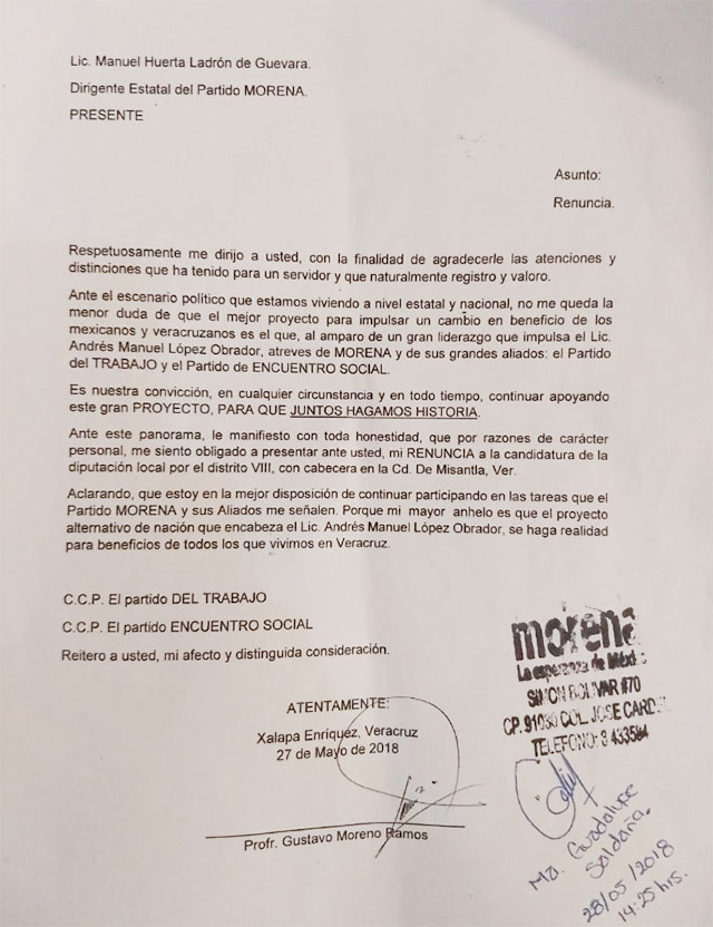 Gustavo Moreno Ramos renunció a la candidatura de MORENA por la Diputación local, con cabecera en Misantla; aludiendo razones de carácter personal.