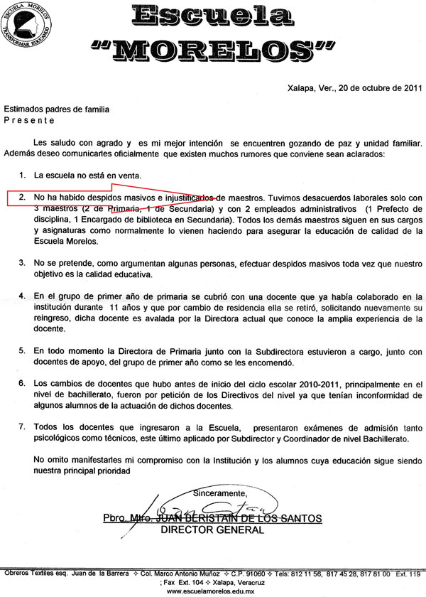 Luego de la manifestación de padres, afuera de la escuela particular José María Morelos y Pavón de Xalapa, la Dirección General, entregó a estos una circular, donde aclara puntualmente que la institución no está en venta y que no hubo ni habrá despidos masivos e injustificados.