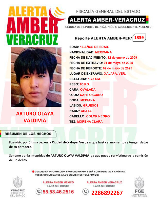 ACTIVACIÓN ALERTA AMBER- VERACRUZ 1339 ARTURO OLAYA VALDIVIA