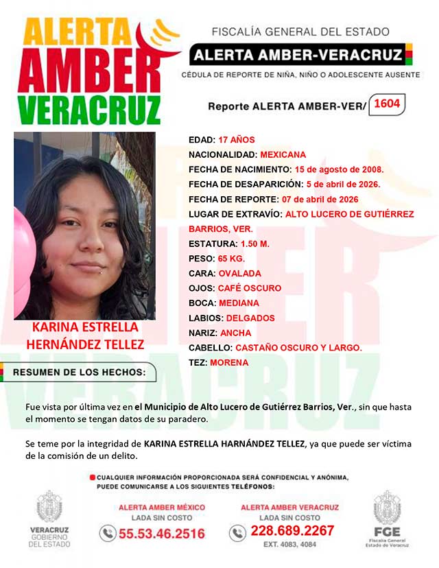 El programa Alerta Amber Veracruz, agradece su colaboración e informa la activación de la ALERTA AMBER- VERACRUZ 1604 por Karina Estrella Hernández Téllez de 17 años de edad