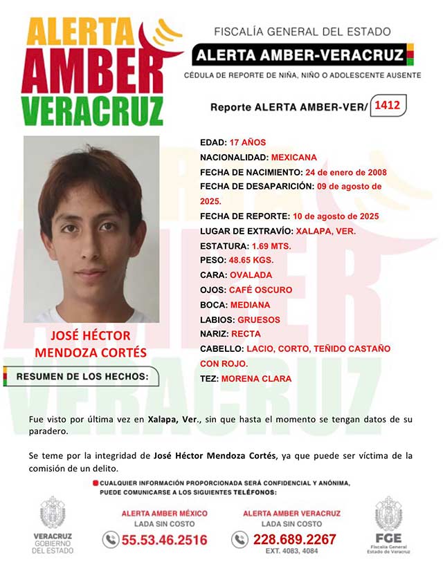 El programa Alerta Amber Veracruz, agradece su colaboración e informa la activación de la ALERTA AMBER- VERACRUZ 1412 por el adolescente José Héctor Mendoza Cortés, de 17 años de edad