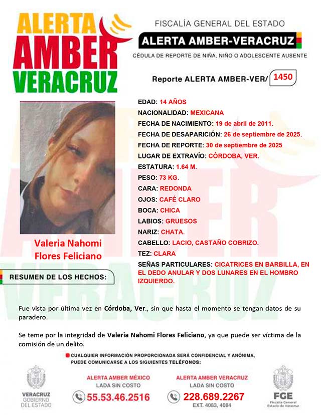 El programa Alerta Amber Veracruz, agradece su colaboración e informa la activación de la ALERTA AMBER- VERACRUZ 1450 por la adolescente Valeria Nahomi Flores Feliciano de 14 años de edad