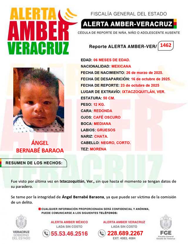 El programa Alerta Amber Veracruz, agradece su colaboración e informa la activación de la ALERTA AMBER- VERACRUZ 1462 por el niño Ángel Bernabé Baraona de 6 meses de edad