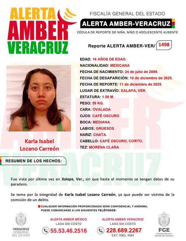 El programa Alerta Amber Veracruz, agradece su colaboración e informa la activación de la ALERTA AMBER- VERACRUZ 1498 por la adolescente Karla Isabel Lozano Carreón de 16 años de edad