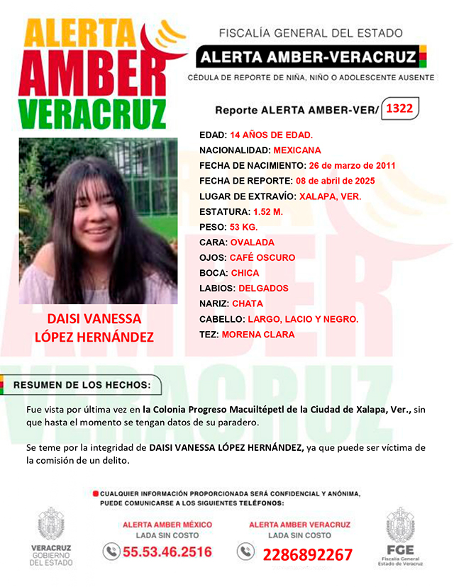 El programa Alerta Amber Veracruz, solicita su colaboración para la activación de la ALERTA AMBER- VERACRUZ 1322 por la adolescente Daisi Vanessa López Hernández de 14 años de edad