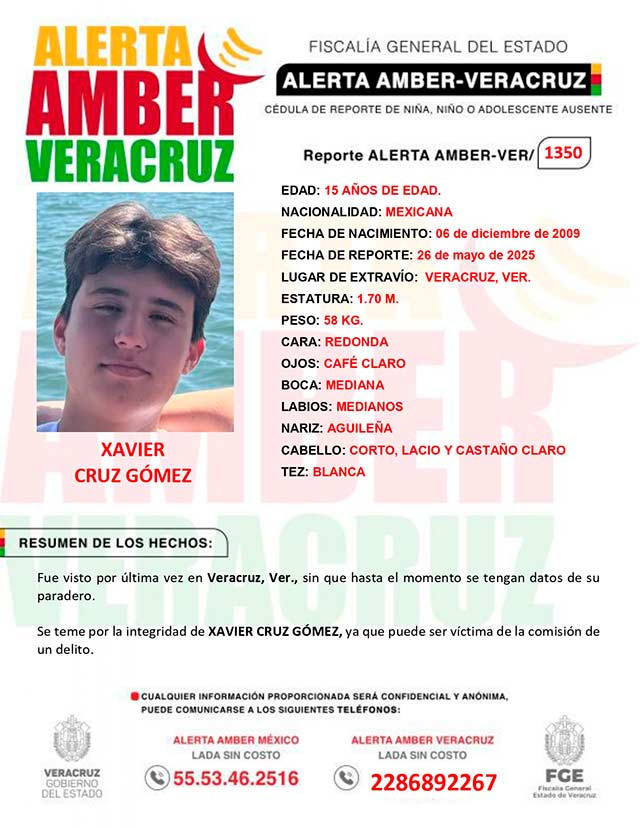 El programa Alerta Amber Veracruz, solicita su colaboración para la activación de la ALERTA AMBER- VERACRUZ 1350 por el adolescente Xavier Gómez Cruz de 15 años de edad