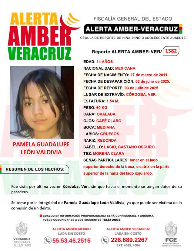 El programa Alerta Amber Veracruz, agradece su colaboración e informa la activación de la AAMBER- VERACRUZ 1382 por la adolescente Pamela Guadalupe León Valdivia, de 14 años de edad