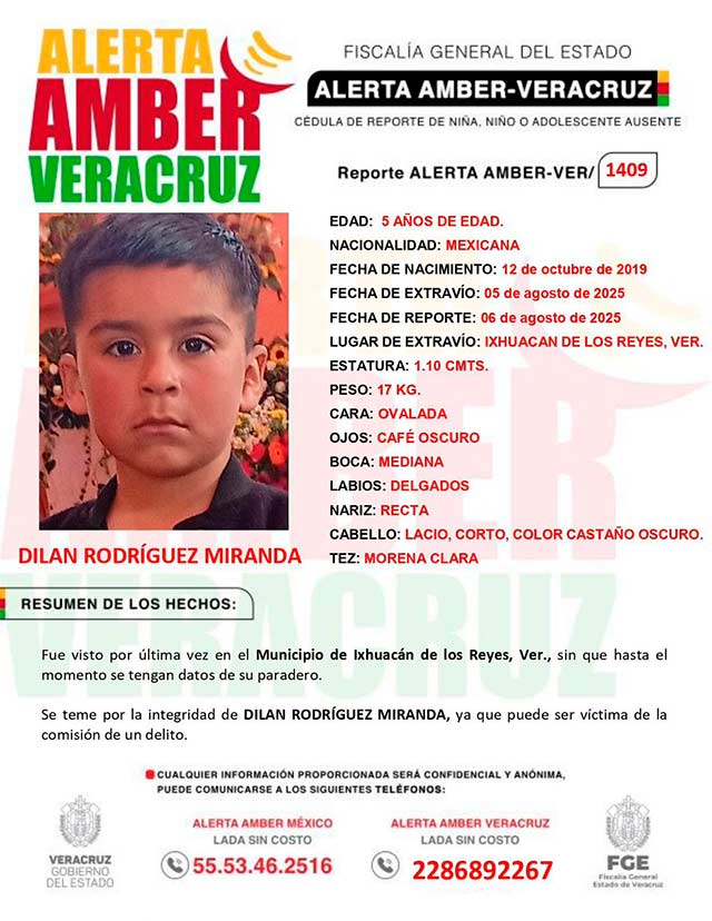 El programa Alerta Amber Veracruz, agradece su colaboración e informa la activación de la AAMBER- VERACRUZ 1409 por el niño Dilan Rodríguez Miranda de 5 años de edad