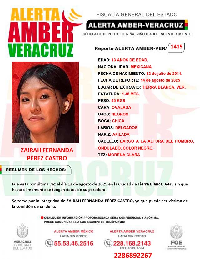 El programa Alerta Amber Veracruz, agradece su colaboración e informa la activación de la ALERTA AMBER- VERACRUZ 1415 por la adolescente Zairah Fernanda Pérez Castro, de 13 años de edad