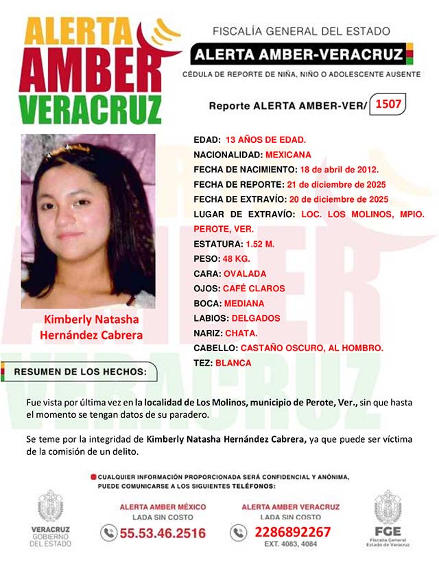 El programa Alerta Amber Veracruz, agradece su colaboración e informa la activación de la ALERTA AMBER- VERACRUZ 1507 por la adolescente Kimberly Natasha Hernández Cabrera de 13 años de edad
