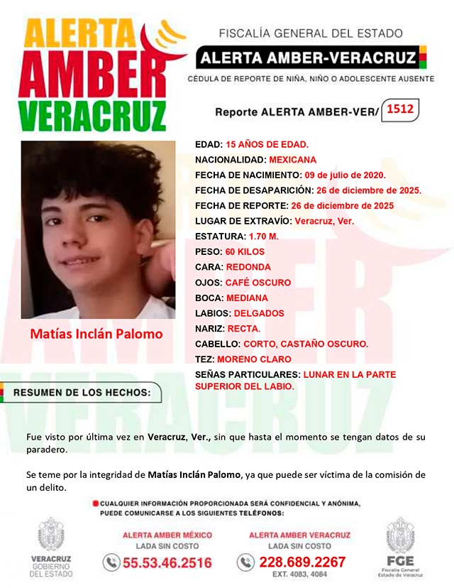 El programa Alerta Amber Veracruz, agradece su colaboración e informa la activación de la ALERTA AMBER- VERACRUZ 1512 por el adolescente Matías Inclán Palomo de 15 años de edad