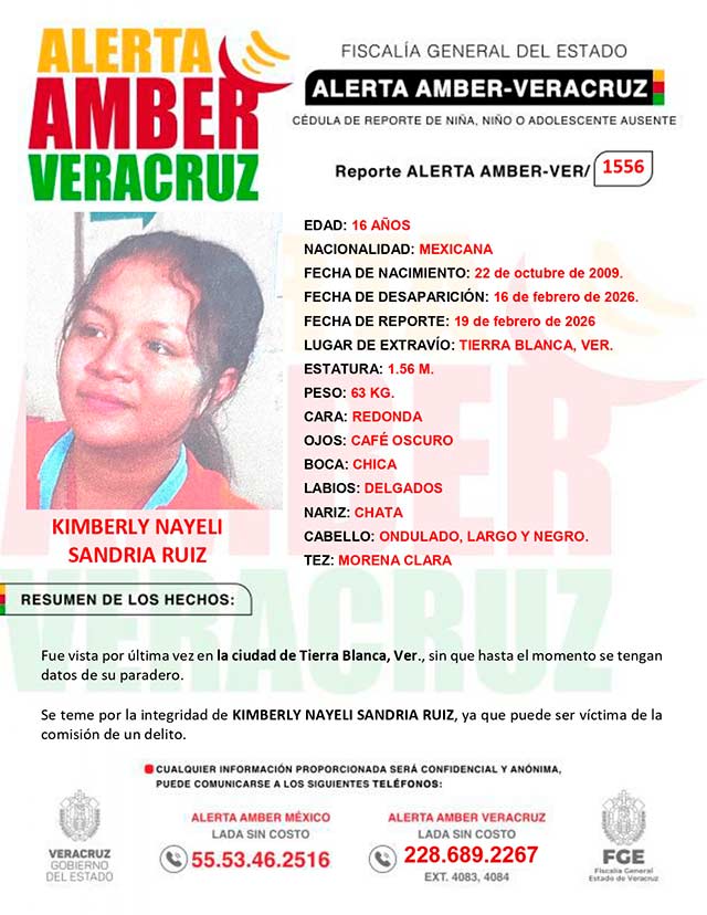 El programa Alerta Amber Veracruz, agradece su colaboración e informa la activación de la ALERTA AMBER- VERACRUZ 1556 por la adolescente Kimberly Nayeli Sandria Ruiz de 16 años de edad