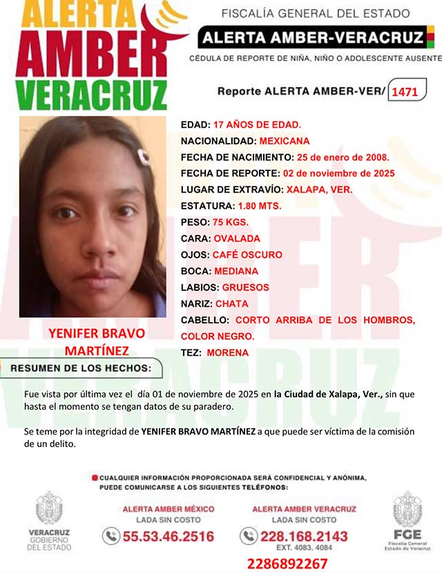 El programa Alerta Amber Veracruz, agradece su colaboración e informa la activación de la ALERTA AMBER- VERACRUZ 1470 por la adolescente Violeta Patricia González Ruiz de 15 años de edad y ALERTA AMBER- VERACRUZ 1471 por la adolescente Yenifer Bravo Martínez de 17 años de edad