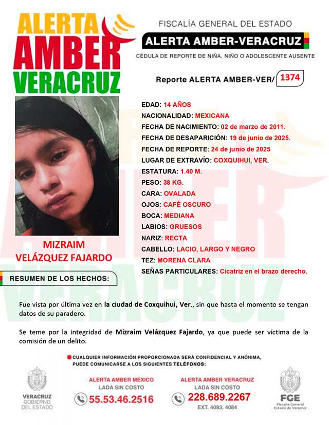 El programa Alerta Amber Veracruz, agradece su colaboración e informa la activación de la AAMBER- VERACRUZ 1374 por la adolescente Mizraim Velázquez Fajardo, de 14 años de edad