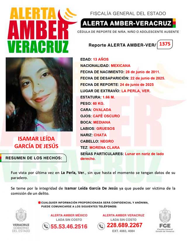 El programa Alerta Amber Veracruz, agradece su colaboración e informa la activación de la AAMBER- VERACRUZ 1375 por la adolescente Isamar Leída García De Jesús, de 13 años de edad