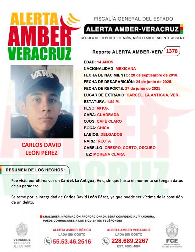 El programa Alerta Amber Veracruz, agradece su colaboración e informa la ACTIVACIÓN de la ALERTA AMBER- VERACRUZ 1378 por la adolescente Carlos David León Pérez, de 14 años de edad.