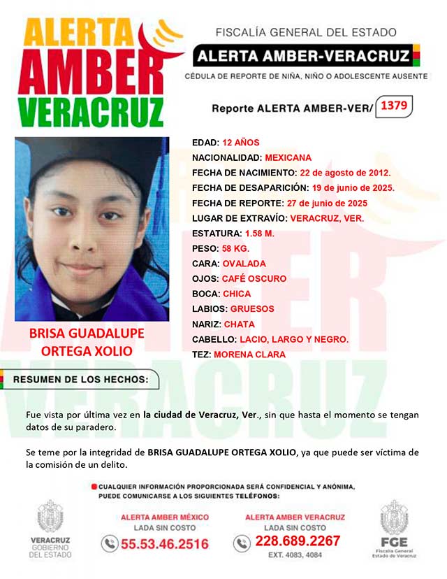 El programa Alerta Amber Veracruz, agradece su colaboración e informa la activación de la AAMBER- VERACRUZ 1379 por la adolescente Brisa Guadalupe Ortega Xolio, de 12 años de edad