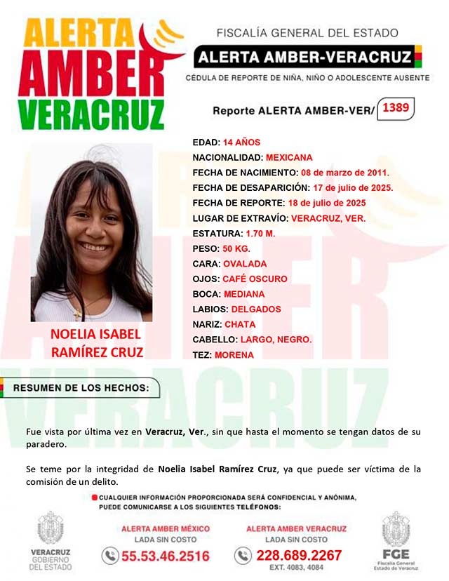 El programa Alerta Amber Veracruz, agradece su colaboración e informa la Activación de la Alerta Amber-Veracruz 1389 por la adolescente Noelia Isabel Ramírez Cruz, de 14 años de edad