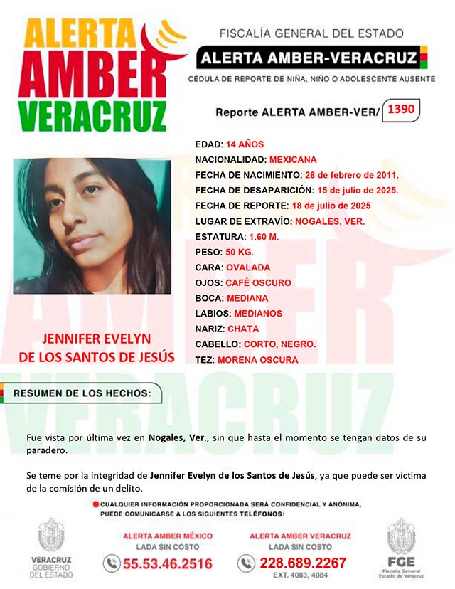El programa Alerta Amber Veracruz, agradece su colaboración e informa la activación de la AAMBER- VERACRUZ 1390 por la adolescente Jennifer Evelyn de los Santos de Jesús, de 14 años de edad