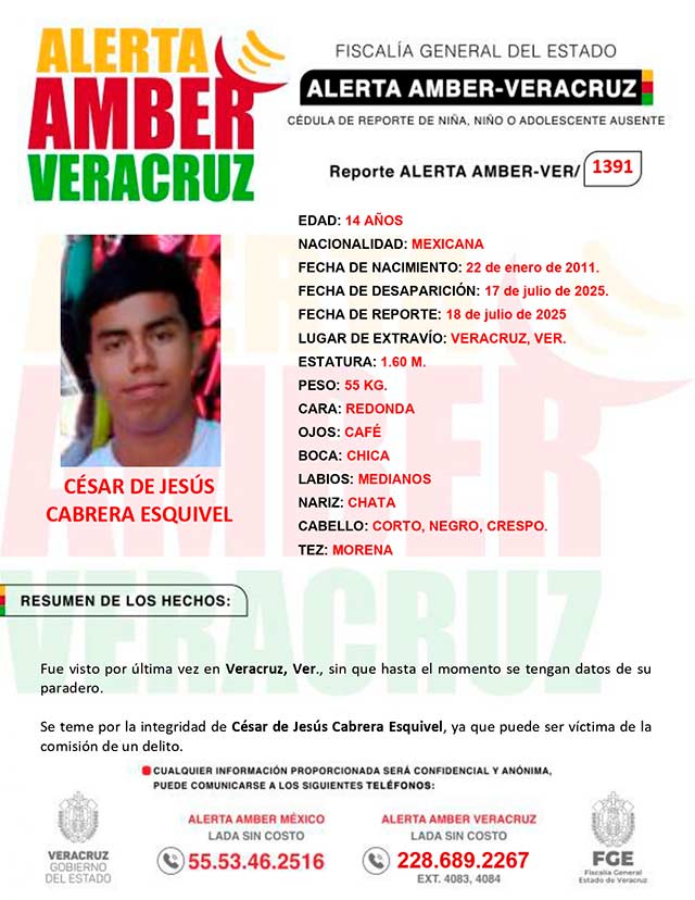 El programa Alerta Amber Veracruz, agradece su colaboración e informa la activación de la AAMBER- VERACRUZ 1391 por el adolescente César de Jesús Cabrera Esquivel, de 14 años de edad