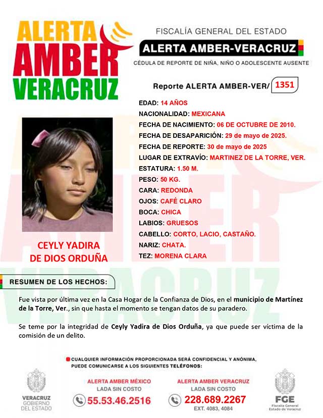 Activación de la Alerta Amber 1351 por la adolescente Ceyly Yadira de Dios Orduña