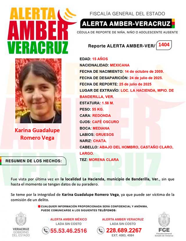 El programa Alerta Amber Veracruz, agradece su colaboración e informa la ACTIVACIÓN de la ALERTA AMBER- VERACRUZ 1402 por la adolescente Karina Guadalupe Romero Vega, de 15 años de edad.
