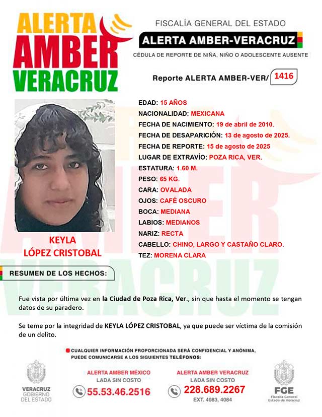 El programa Alerta Amber Veracruz, agradece su colaboración e informa la ACTIVACIÓN de la ALERTA AMBER- VERACRUZ 1416 por la adolescente KEYLA LOPEZ CRISTOBAL, de 15 años de edad.