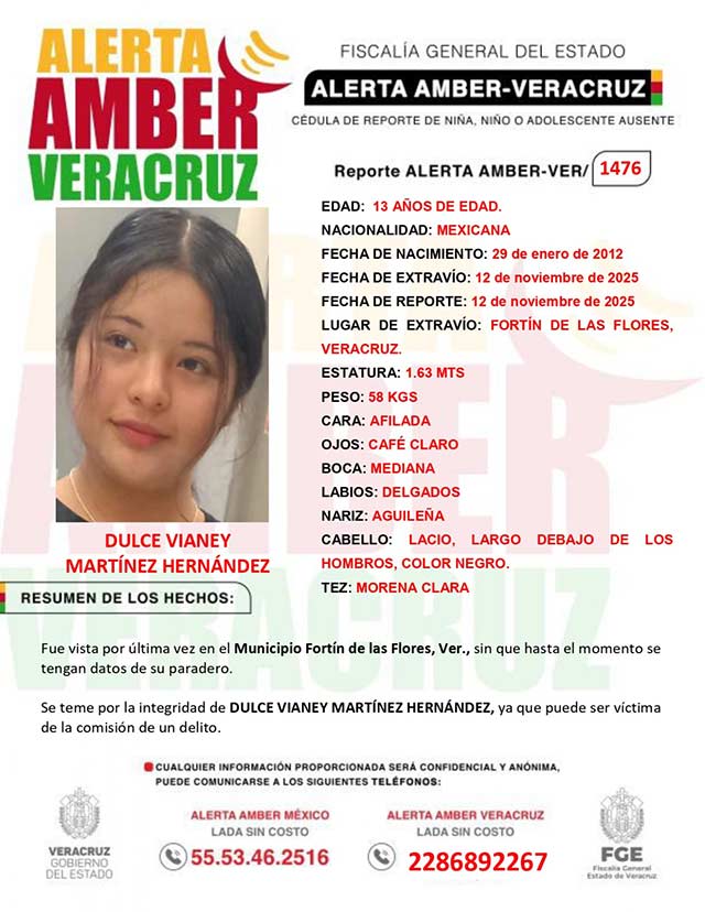 El programa Alerta Amber Veracruz, agradece su colaboración e informa la ACTIVACIÓN de las ALERTA AMBER- VERACRUZ 1476 por la adolescente Dulce Vianey Martínez Hernandez de 13 años de edad