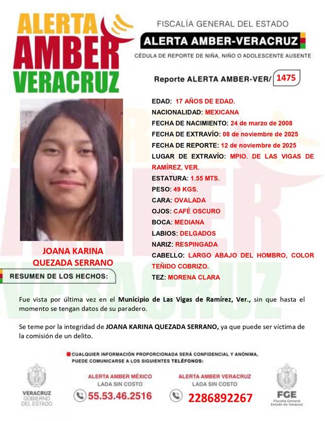 El programa Alerta Amber Veracruz, agradece su colaboración e informa la ACTIVACIÓN de las ALERTA AMBER- VERACRUZ 1475 por la adolescente Joana Karina Quezada Serrano de 17 años de edad