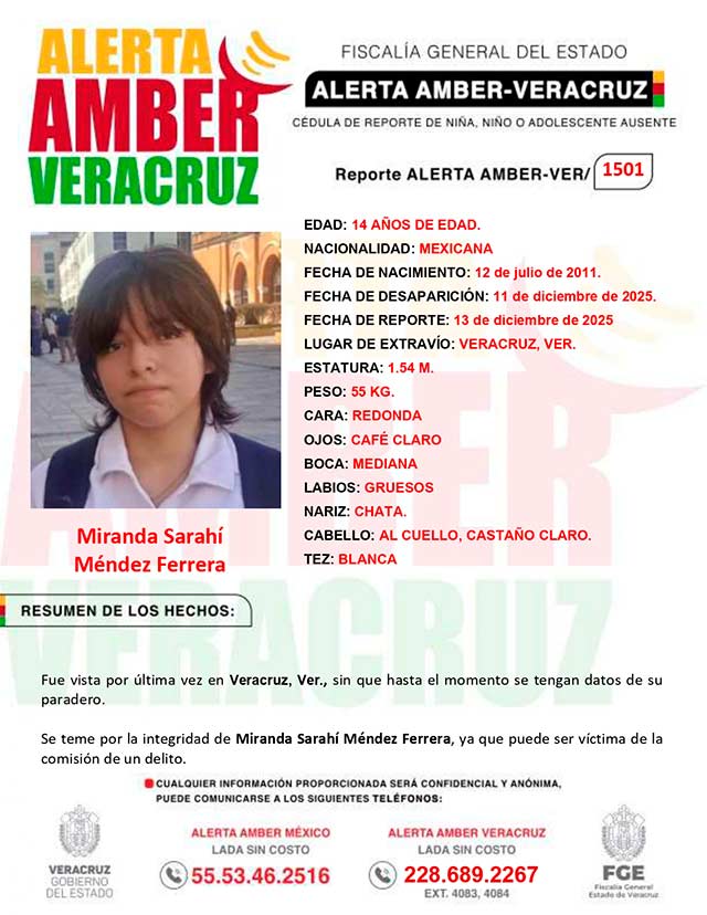 El programa Alerta Amber Veracruz, agradece su colaboración e informa la ACTIVACION de la ALERTA AMBER- VERACRUZ 1501 por la adolescente