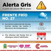 El director de Protección Civil, David Esponda, informó que se mantiene activa una Alerta Gris, emitida por la Secretaría de Protección Civil del estado, debido a que se prevé que los primeros efectos del frente frío comiencen a sentirse el sábado, con un incremento significativo durante el domingo. Detalló que para el sábado se esperan rachas de viento de entre 70 kilómetros por hora, mientras que para el domingo podrían superar los 110 kilómetros por hora, acompañadas de lluvias intensas que podrían rebasar los 150 milímetros, lo que incrementa el riesgo de encharcamientos, inundaciones y afectaciones estructurales.