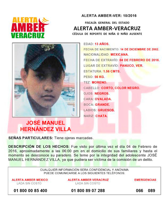 La Fiscalía General del Estado (FGE), en calidad de coordinadora del programa a nivel estatal, activó la Alerta Amber-Ver 10/2016 con motivo de la no localización de José Manuel Hernández Villa.