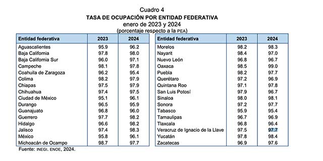 El Instituto Nacional de Estadística y Geografía (INEGI), responsable de la publicación, estimó para el mes de enero de 2024 una tasa de población ocupada (con empleo) de 97.7 por ciento, mientras que para diciembre y noviembre del año pasado esta fue de 97.8 por ciento.