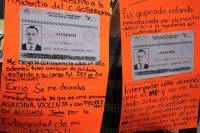 Esposa y exesposa del trabajador administrativo de Ayudantía del Gobierno del Estado, José Alfredo Carmona Ortiz, se manifiestan en la Plaza Lerdo para exigir que se actúe en contra del trabajador de gobierno por agresiones y violencia.