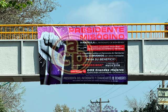Xalapa, Ver., 9 de marzo de 2026.- Lona colocada en puente de peatonal frente a la Normal Veracruzana acusa misoginia y manipulación en el patronato de bomberos. “Presidente misógino. Manipula el patronato de Bomberos. Mejor conocido por la famosa licuadora financiera y orquestador de empresas fantasma. En la actualidad, utiliza al Patronato de Bomberos para realizar convenios con otros municipios para su beneficio. Planea reelegirse para evitar que dos grandes mujeres puedan dirigir con honestidad a los bomberos”, se lee.