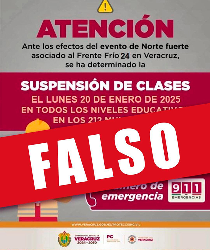 La secretaría de Protección Civil advierte sobre un aviso falso de suspensión de clases este 20 de enero.