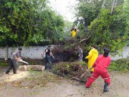 En la colonia Hernández Ochoa se desplegaron cuadrillas para retirar un enorme árbol que cayó sobre una barda y obstaculizaba la circulación vial.