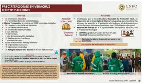 Durante la Conferencia del Pueblo, la presidenta Claudia Sheinbaum Pardo y la titular de la Coordinación Nacional de Protección Civil (CNPC), Laura Velázquez Alzúa, informaron que las lluvias registradas en el país provocaron afectaciones en 38 municipios de Veracruz, con al menos 5 mil viviendas dañadas en el municipio de Álamo.