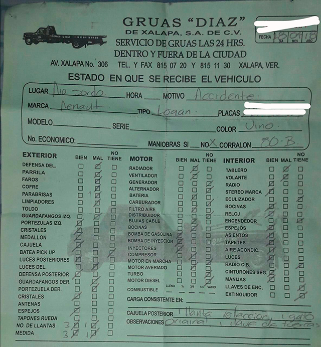 “El encargado de la grúa, de quien desconozco su nombre, me dio a firmar el inventario; signé confiando en que su trabajo era honesto y responsable, pues contaba con que la cajuela no la iban a poder abrir. Sin embargo, el miércoles acudí a retirar mis pertenencias y me percaté de que me faltaban las dos lentes de la cámara fotográfica, además de ropa que tenía guardada en mi maleta de equipaje”, declaró.