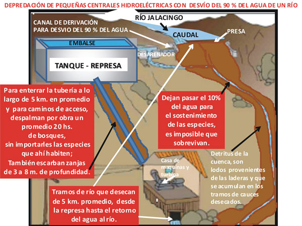 El tercer tipo es el más depredador de la naturaleza, se trata de hidroeléctricas con “Derivación del caudal y entubamiento del agua”, al río le ponen una cortina del ancho del cauce para desviar el 90 % del agua del río hacia un enorme tanque de represamiento donde la embalsan, para de ahí inducirla a través de una tubería enterrada de 3 a 8 metros de profundidad, lo que generará derrumbes al perderse la estabilidad de los suelos de las laderas inclinadas asociado a las lluvias intensas y el uso de dinamita, lo que incrementará el azolve de los ríos e incremento de niveles de inundación; estos tramos generalmente promedian 5 kilómetros de longitud, aunque en un río por ser zigzagueante, la longitud afectada será mayor a la longitud del entubamiento, como en el proyecto de “El Naranjal” donde se pretenden afectar 22 km.