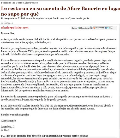Aprovecho la ocasión para saludarles y comentar que llegó a nosotros esta queja respecto a Afore XXI Banorte, a la cual quisiéramos dar seguimiento.