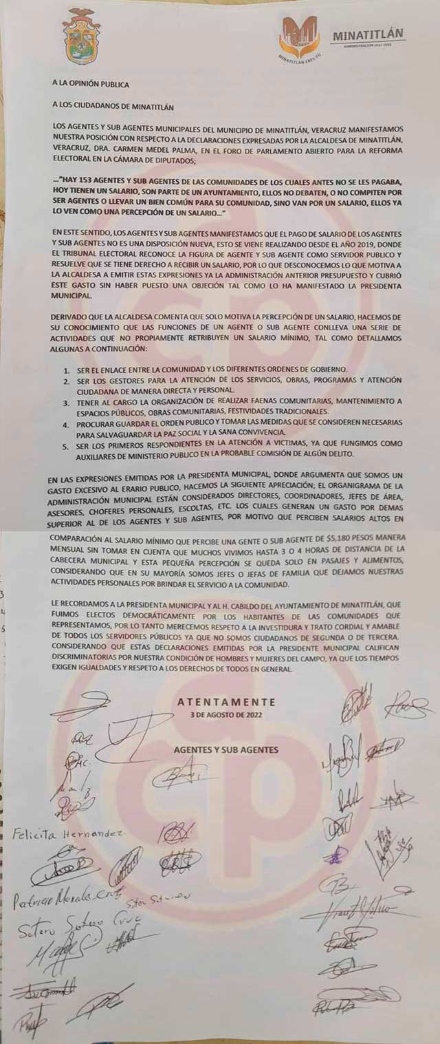 "Queremos una disculpa pública de la alcaldesa Carmen Medel por lo dicho en su comparecencia en uno de los foros de la Reforma Electoral donde argumenta que 153 agentes y subagentes cobran un salario, que es algo nuevo y que representa para ellos una carga o un gasto muy fuerte. Queremos que sepan los ciudadanos que el salario o la percepción económica es mínima, es en el tenor de 5 mil 180 pesos mensuales de los cuales tiene que hacer uso para los trámites que corresponde a la gestión ante el Ayuntamiento para obras, servicios, tiene que venir a las reuniones convocadas, tienen que dar tiempo para emitir constancias de residencia, de identidad, tiene que fungir como auxiliar de Ministerio Público para dirimir acciones de conciliación entre vecinos, conflictos entre poseedores o propietarios de tierra, faenas de manera comunitaria y más", dijo.