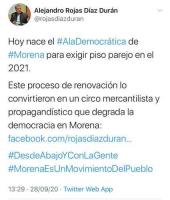 Por considerar que el proceso de renovación de la dirigencia nacional del Partido Movimiento de Regeneración Nacional (MORENA) lo convirtieron en un circo mercantilista y propagandístico que degrada la democracia en el instituto, el candidato la presidencia del Comité Ejecutivo Nacional Alejandro Rojas se retiró de la contienda y formó un nuevo grupo interno.