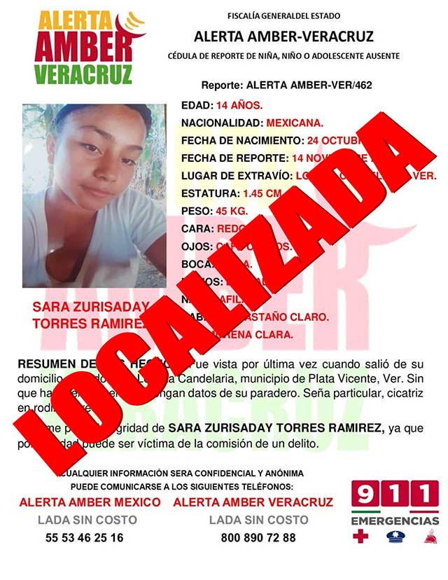 El programa Alerta Ámber Veracruz informa de la desactivación de la Alerta Ámber-VER 462 por la adolescente Sara Zurisaday Torres Ramírez, de 14 años de edad.