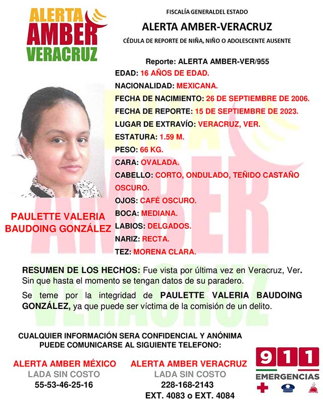 El programa Alerta Amber Veracruz, solicita su colaboración para la ACTIVACIÓN de la Alerta Amber-VER 955 por la adolescente Paulette Valeria Baudoing González.