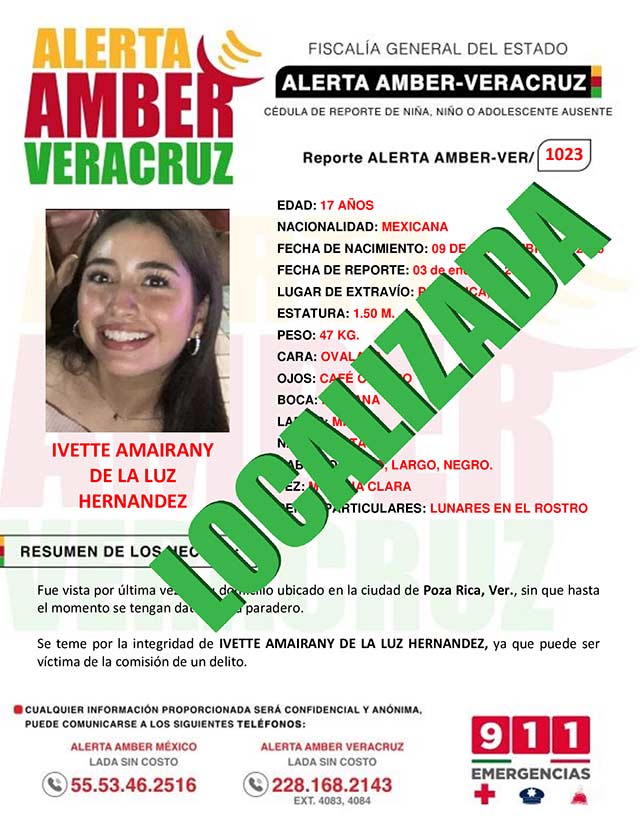 La Coordinación Estatal del Programa AAMBER-VER, informa laDESACTIVACIÓN de la Alerta Amber 1023por la adolescente
