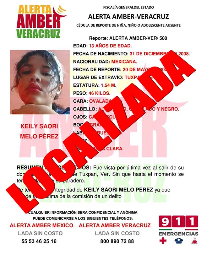 El programa Alerta Amber Veracruz informa de la desactivación de la cédula ALERTA AMBER-VER 588 por la búsqueda de la niña Keily Saori Melo Pérez de 13 años de edad, por haber sido localizada.
